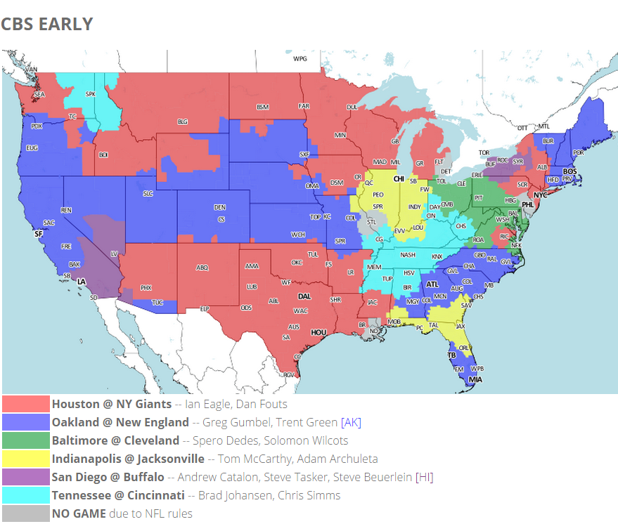 Heres a look at the broadcast maps for Week 10 courtesy of 506 Sports. The color codes and. The folks at 506 Sports provide this weeks NFL TV and coverage map.